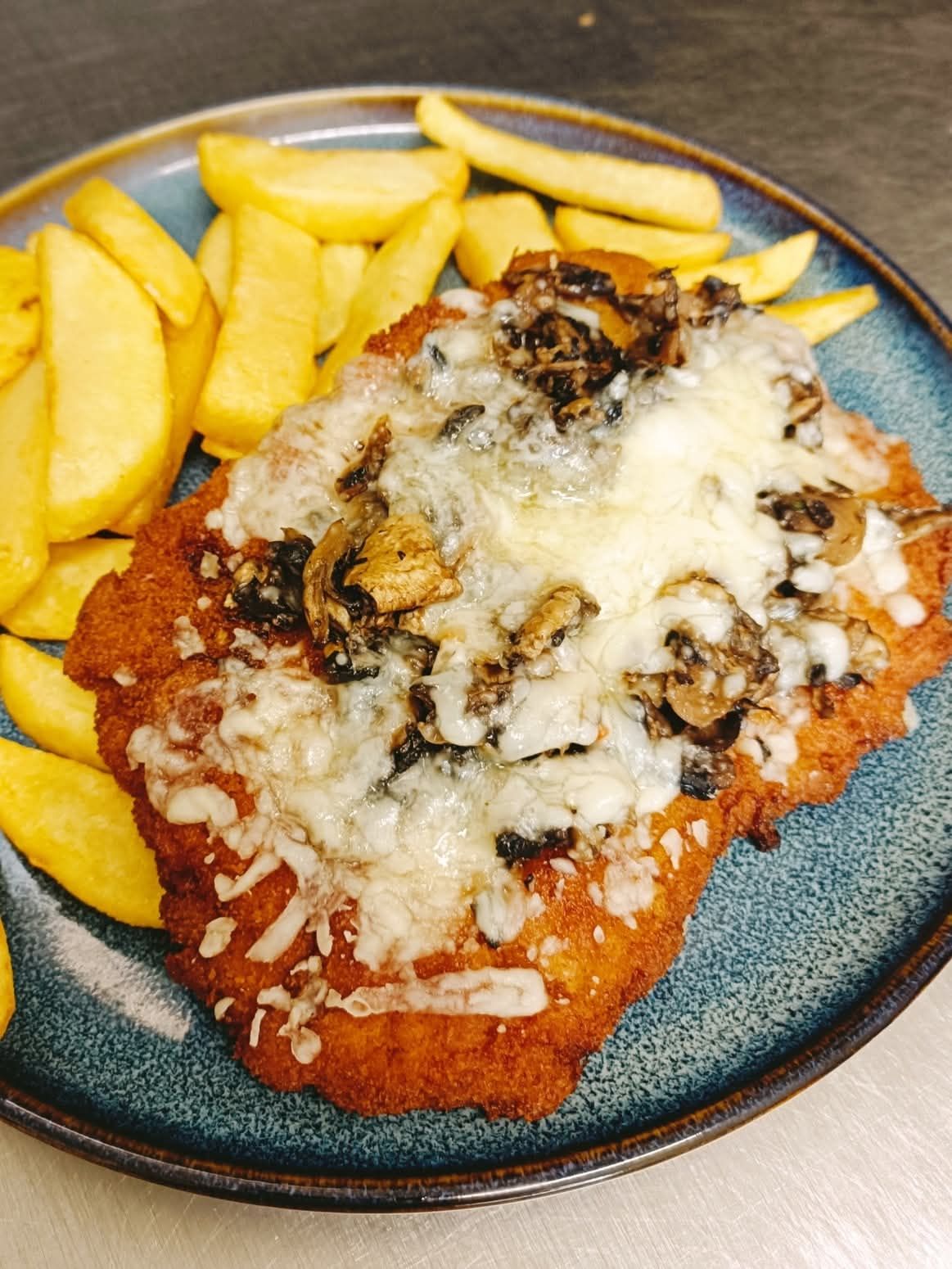 Sznycel z piersi z kurczaka po hawajsku zapiekany z ananasem i serem żółtym